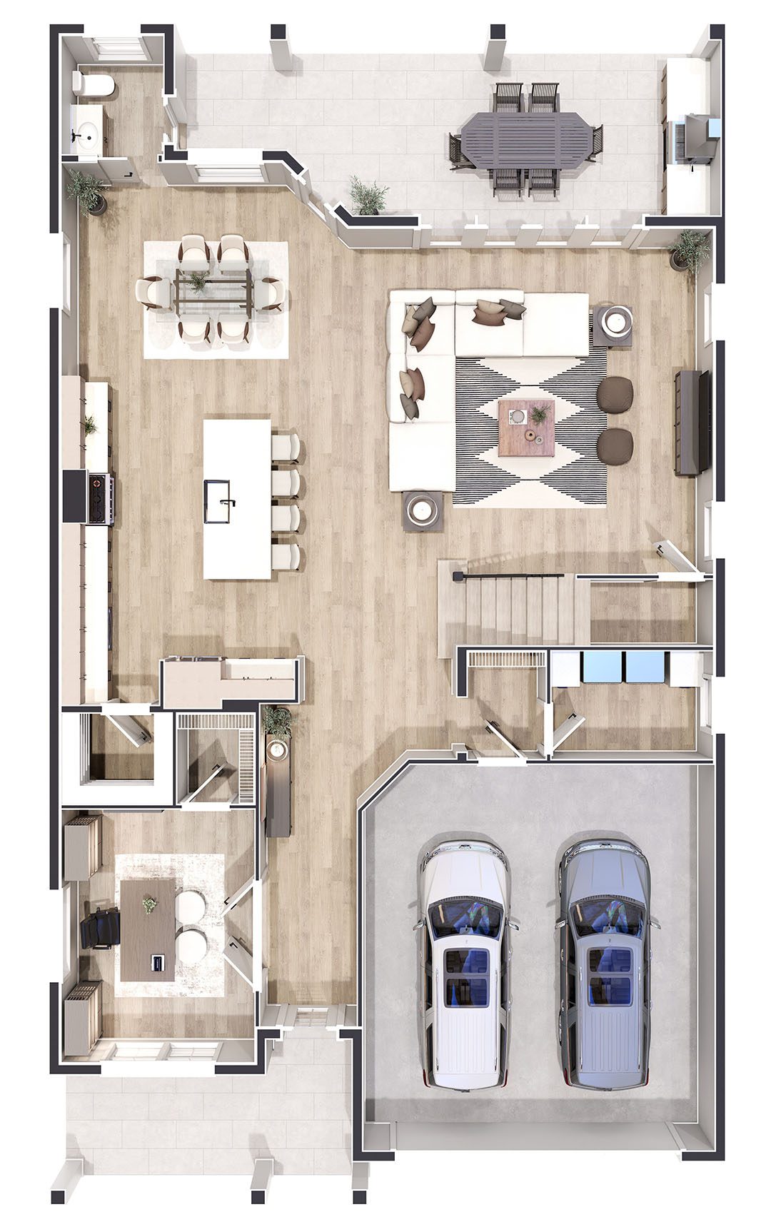 The Aveline is a two-story modern farmhouse that blends timeless charm with fresh, modern styling. An open-concept main level connects a spacious great room, gourmet kitchen, and dining area, with expansive windows and a covered lanai that highlight natural light and indoor outdoor living. Upstairs, a serene owner’s suite, additional bedrooms, and a versatile loft offer comfortable, well-planned spaces for everyday living and entertaining.